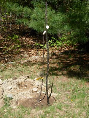 First, a Gala apple. I like Gala apples from the supermarket, and my book on growing apples says that fresh locally grown Galas are way better than supermarket ones. Certainly I like my homegrown Red Delicious apples better than supermarket ones. So, even though it’s all we can do in September and October to keep up with the apple trees we already have, I put in a dwarf Gala. I followed the planting instructions, digging a nice deep, wide hole, spreading out the roots, and tamping the soil down carefully.