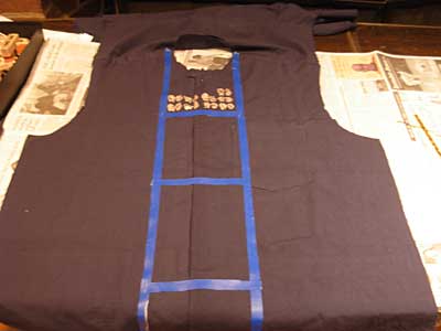 Arlene showed me some pictures of Adinkra fabric, from a book on African fabric in her vast art library. It’s done in smallish rectangular or square patches, separated with other motifs. She suggested using masking tape to define the rectangles. Since I’m printing it after sewing the front facings on, I could overlap the fronts to match the center lines, so the patterns on the two fronts will match perfectly when it’s done.